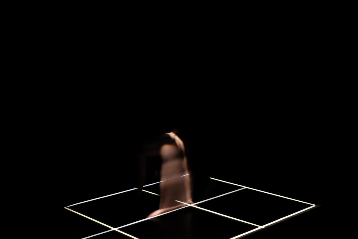 Imagine a blacked-out room. The floor is marked out with white tape: a rectangle, between 3 and 5 metres long, divided into four smaller rectangles. A further line extends out from the middle of one short side. From overhead, tightly shuttered lights pick out the tape lines without lighting the remainder of the floor. The light beams are invisible in the air, and the tape seems to glow of its own accord. To one side, a table, carrying several viewfinders, each comprising a piece of clear Perspex the size of an A4 sheet of paper, with a handle to hold it by. You have entered the space of Traces...